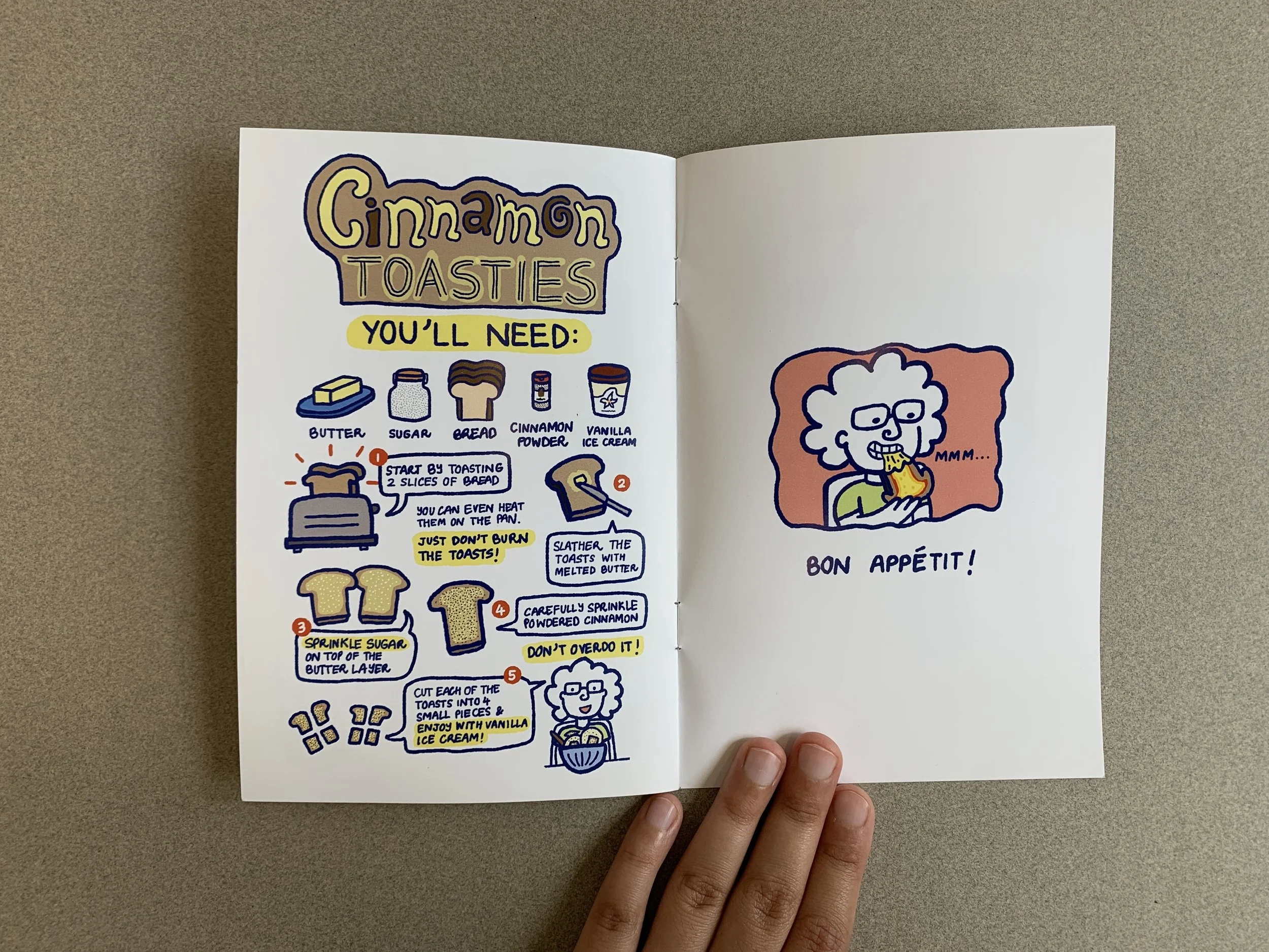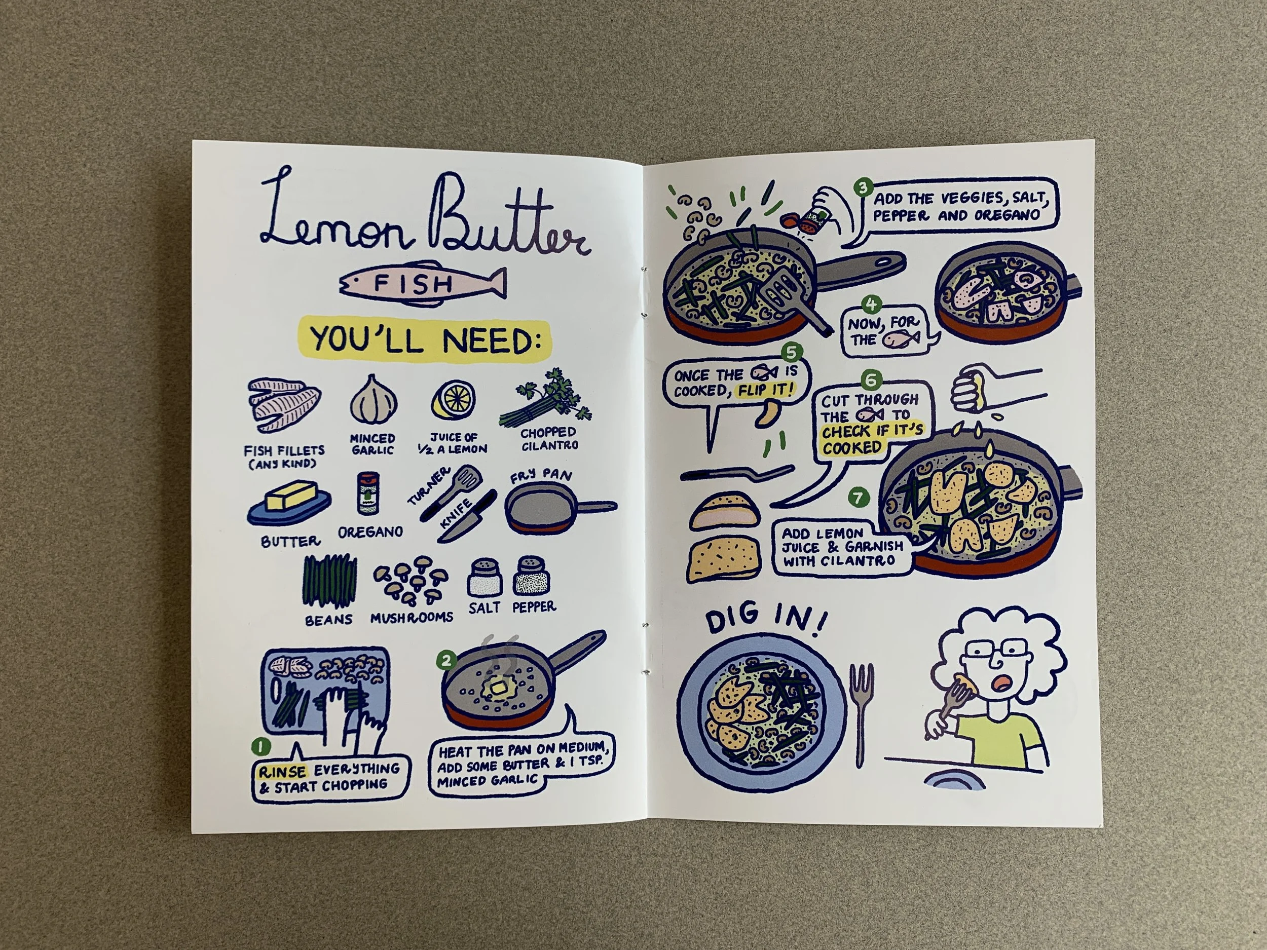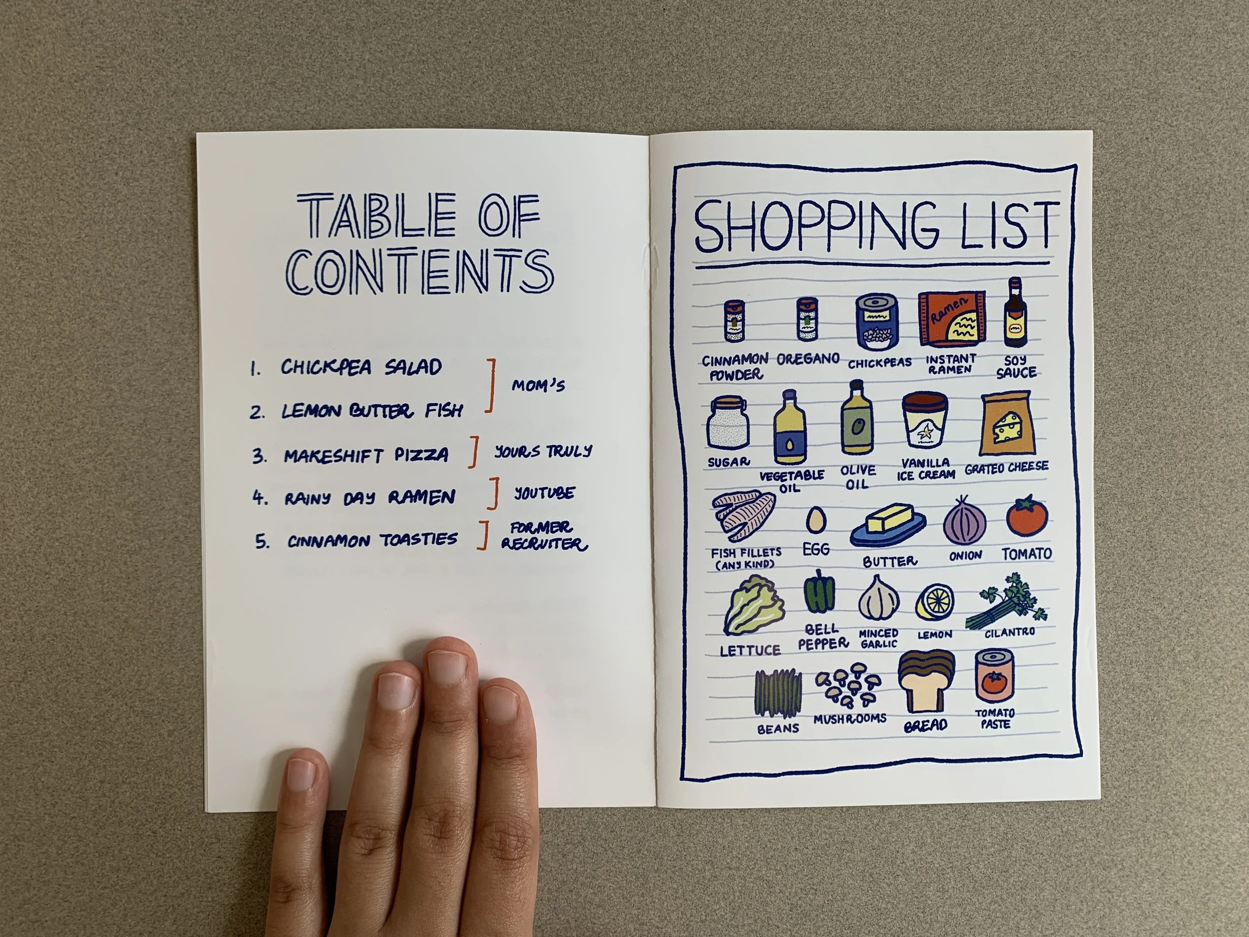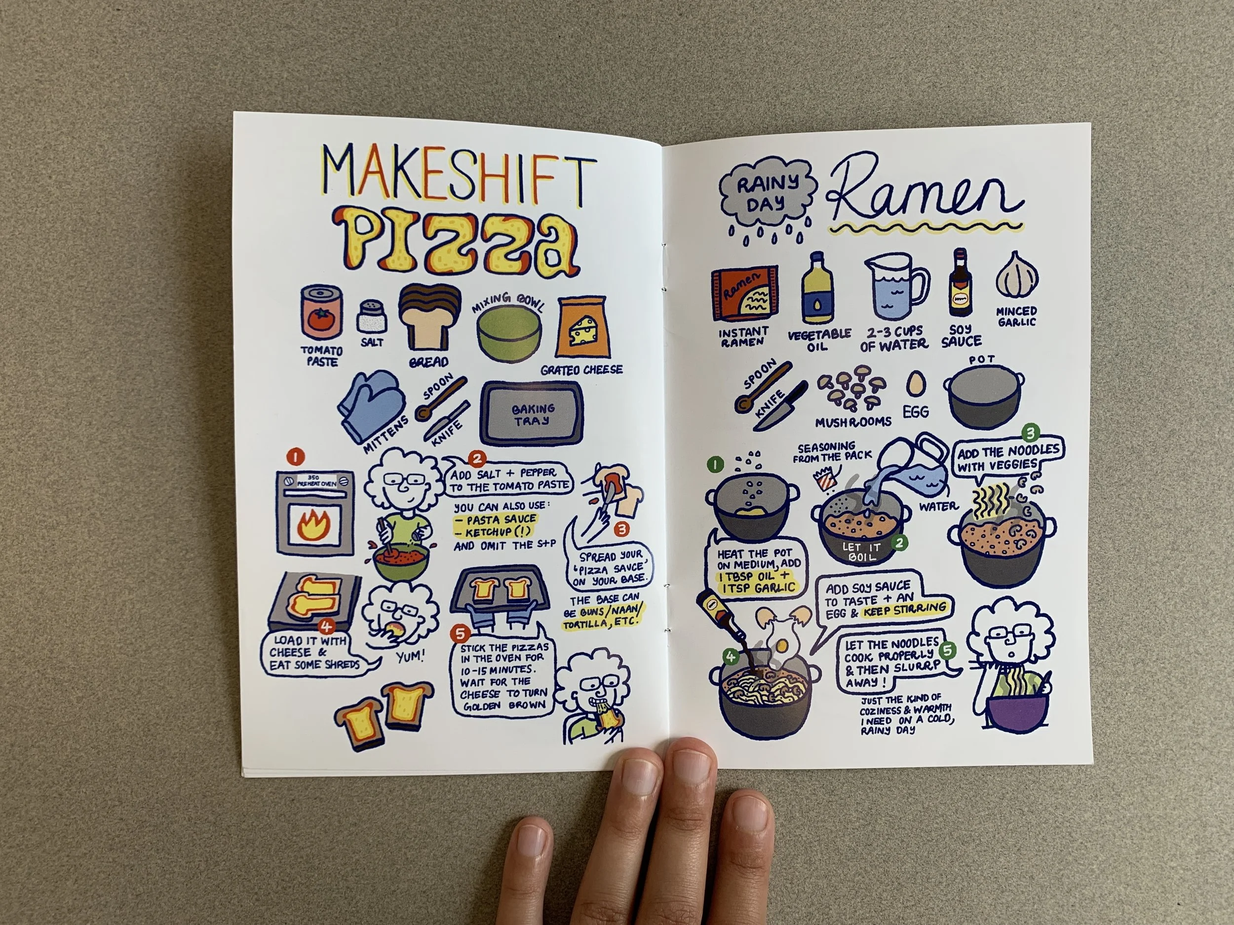 A zine of quick and easy recipes for a college student, by a college student. Whether it’s a salad, pizza or dessert—this zine’s got you covered!